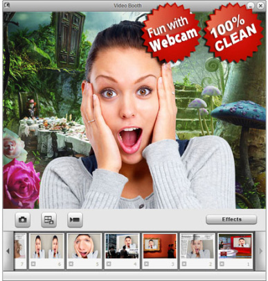 Video Booth là ứng dụng miễn phí có thể giúp bạn tạo snapshot và ghi lại video clip nhanh chóng và dễ dàng. Người dùng có thể thêm các hiệu ứng độc đáo có trong Video Booth vào các bức ảnh và video, trực tiếp đăng tải chúng lên web, chia sẻ giây phút vui vẻ với người thân trong gia đình và bạn bè. Với một chiếc webcam, bạn cũng có thể tạo snapshot và video dễ dàng hơn bằng Video Booth. Mở Video Booth, xem thấu kính, chỉnh sửa tầm nhìn và kích vào nút Snap. Video Booth sẽ đếm ngược trong vòng 3 giây để chụp và lưu bản chụp ở dưới cửa sổ chính. Kích vào thumbnail để xem nó, đăng tải trực tiếp lên web hoặc xuất sang các folder khác. Ghi video cũng rất dễ dàng như việc chụp ảnh và tính năng Continuous Shooting cũng rất thú vị.